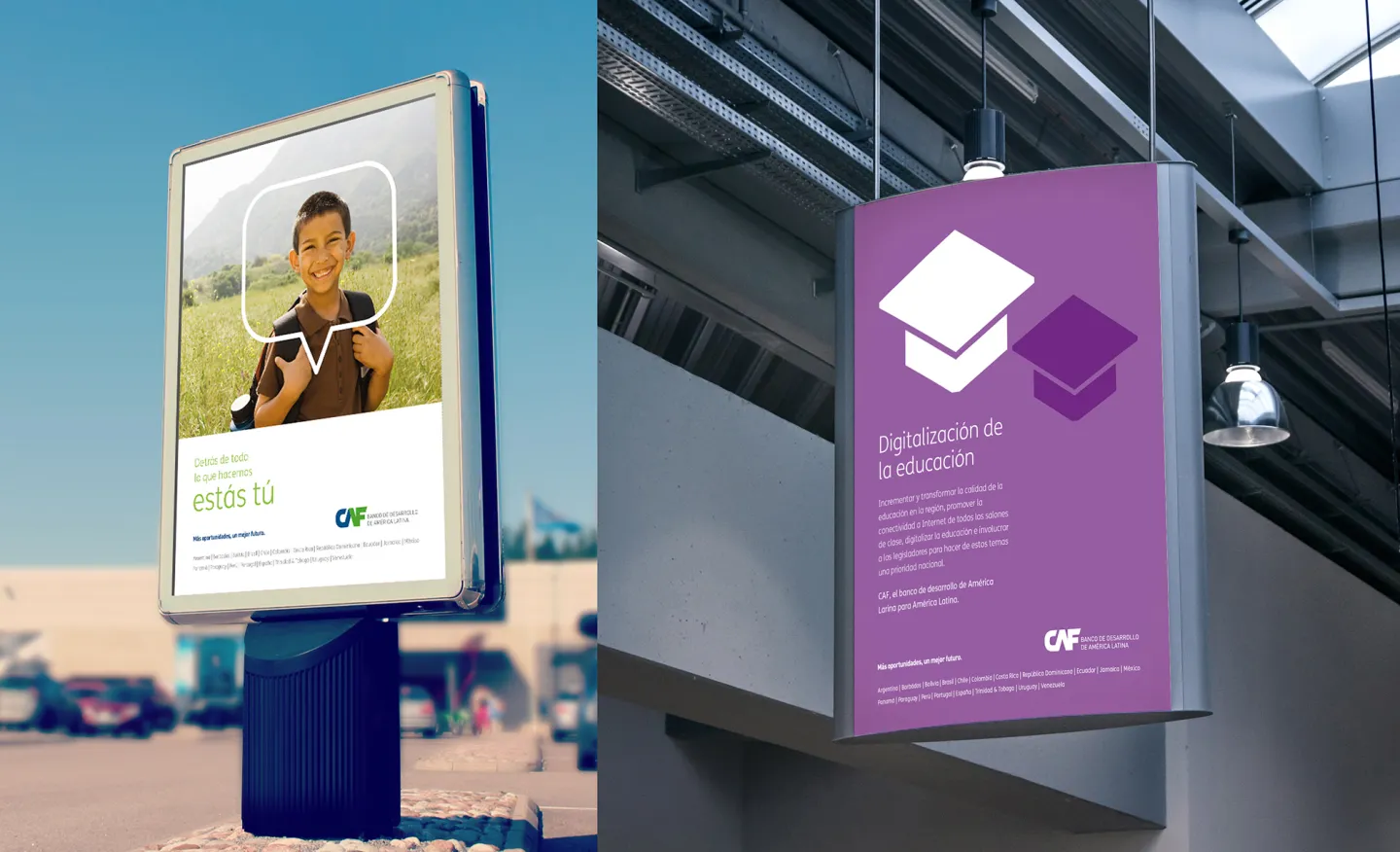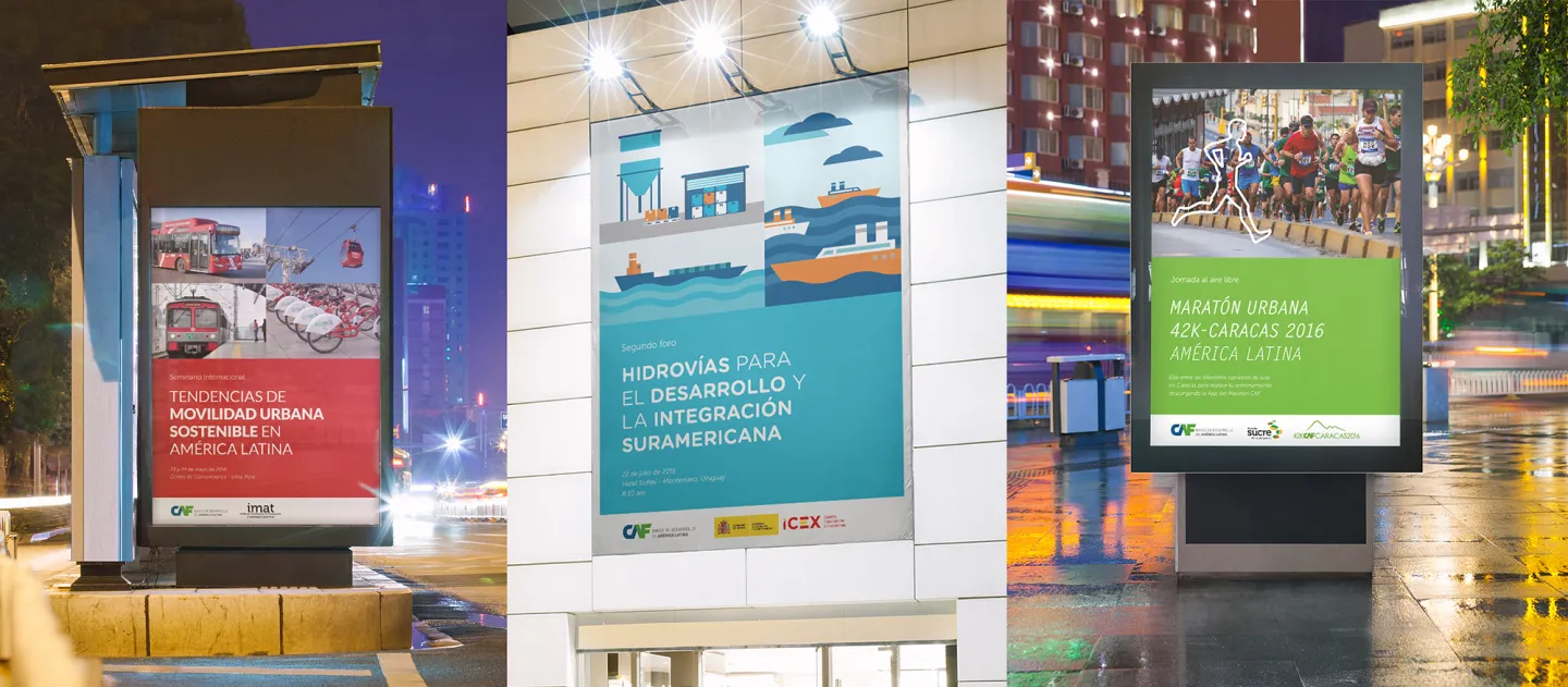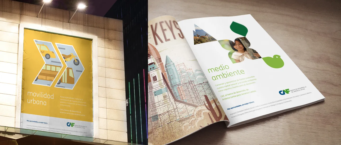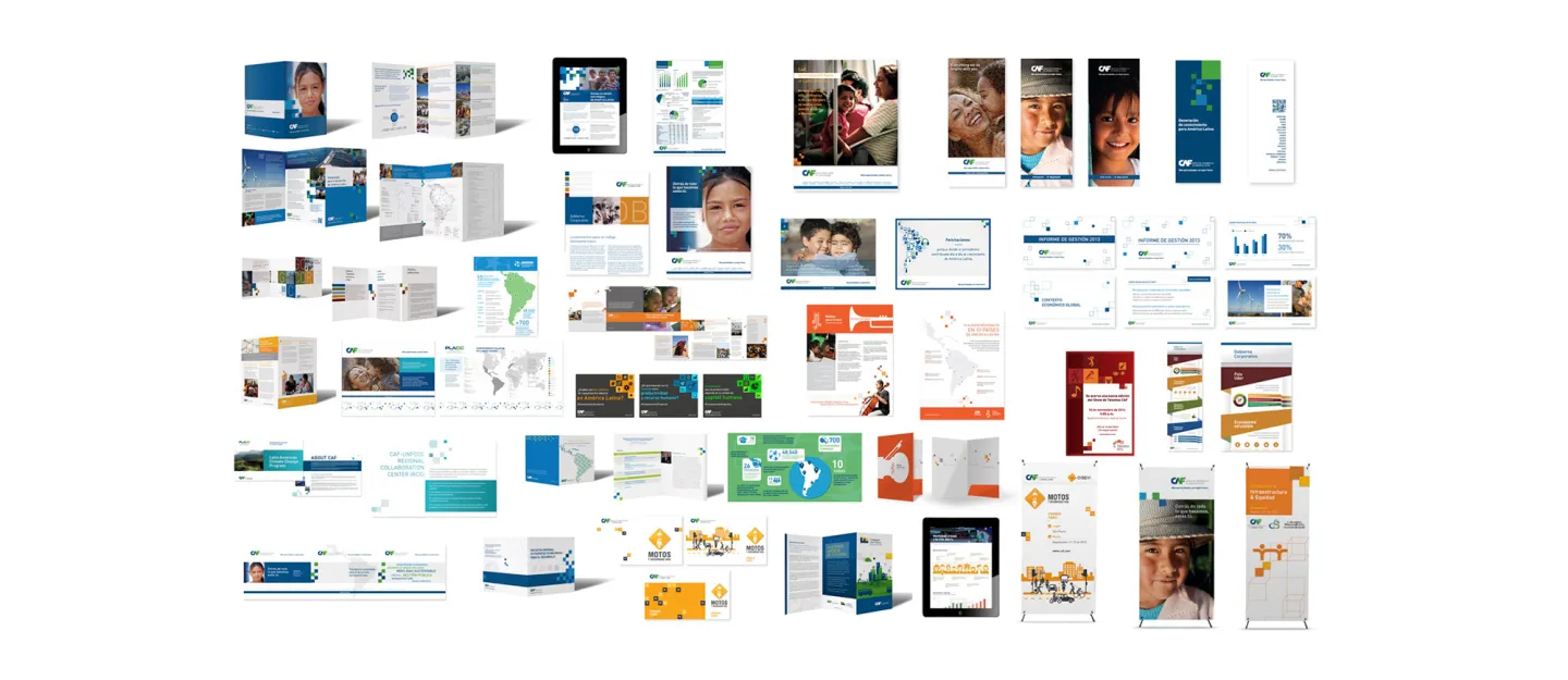 Art direction in total rebranding of CAF identity, Development Bank of Latin America. CAF is a development bank made up of 19 countries – 17 from Latin America and the Caribbean, Spain and Portugal – and 13 private banks from the region. It promotes a sustainable development model, through credit operations, non-reimbursable resources and support in the technical and financial structuring of projects in the public and private sectors of Latin America. Based in Caracas, Venezuela, it has offices in Buenos Aires, La Paz, Brasilia, Bogotá, Quito, Madrid, Mexico City, Panama City, Asunción, Lima, Montevideo and Port of Spain. Under the concept “You are behind that everything that we do” we create the new identity, which is characterized by simplification and rationality, resulting in clean, clear and elegant pieces. The new design poses a great reduction in information, focusing mainly on image and communication. White becomes a key element of the system, giving the pieces strength, prominence and quick reading.