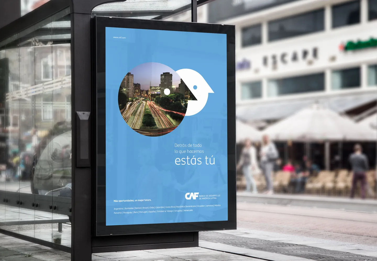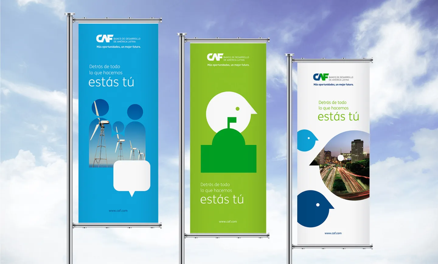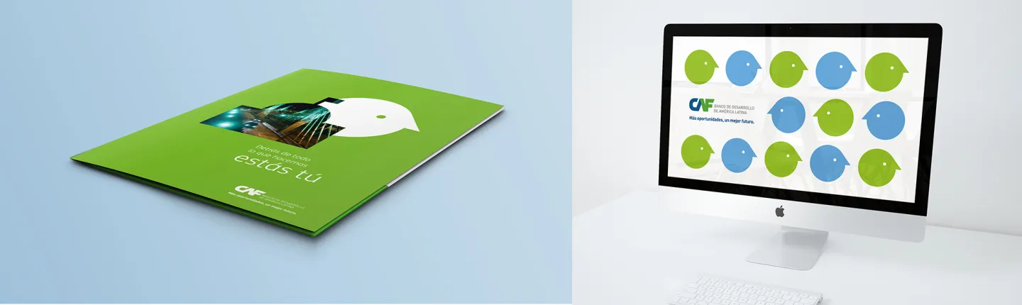 Dirección de arte de rebranding total de la identidad de CAF, Banco de desarrollo de América Latina. CAF es un banco de desarrollo conformado por 19 países – 17 de América Latina y el Caribe, España y Portugal- y 13 bancos privados de la región. Promueve un modelo de desarrollo sostenible, mediante operaciones de crédito, recursos no reembolsables y apoyo en la estructuración técnica y financiera de proyectos de los sectores público y privado de América Latina. Con sede en Caracas, Venezuela, cuenta con oficinas en Buenos Aires, La Paz, Brasilia, Bogotá, Quito, Madrid, México D.F, Ciudad de Panamá, Asunción, Lima, Montevideo y Puerto España. Bajo el concepto “Detrás de todo lo que hacemos estás tú” creamos la nueva identidad, que se caracteriza por la simplificación y racionalidad, dando como resultado piezas limpias, claras y elegantes. La nueva estética plantea una gran reducción de la información, focalizándose mayormente en la imagen y la comunicación. El blanco se transforma en un elemento clave del sistema, lo que le brinda fuerza, pregnancia y rápida lectura a las piezas.