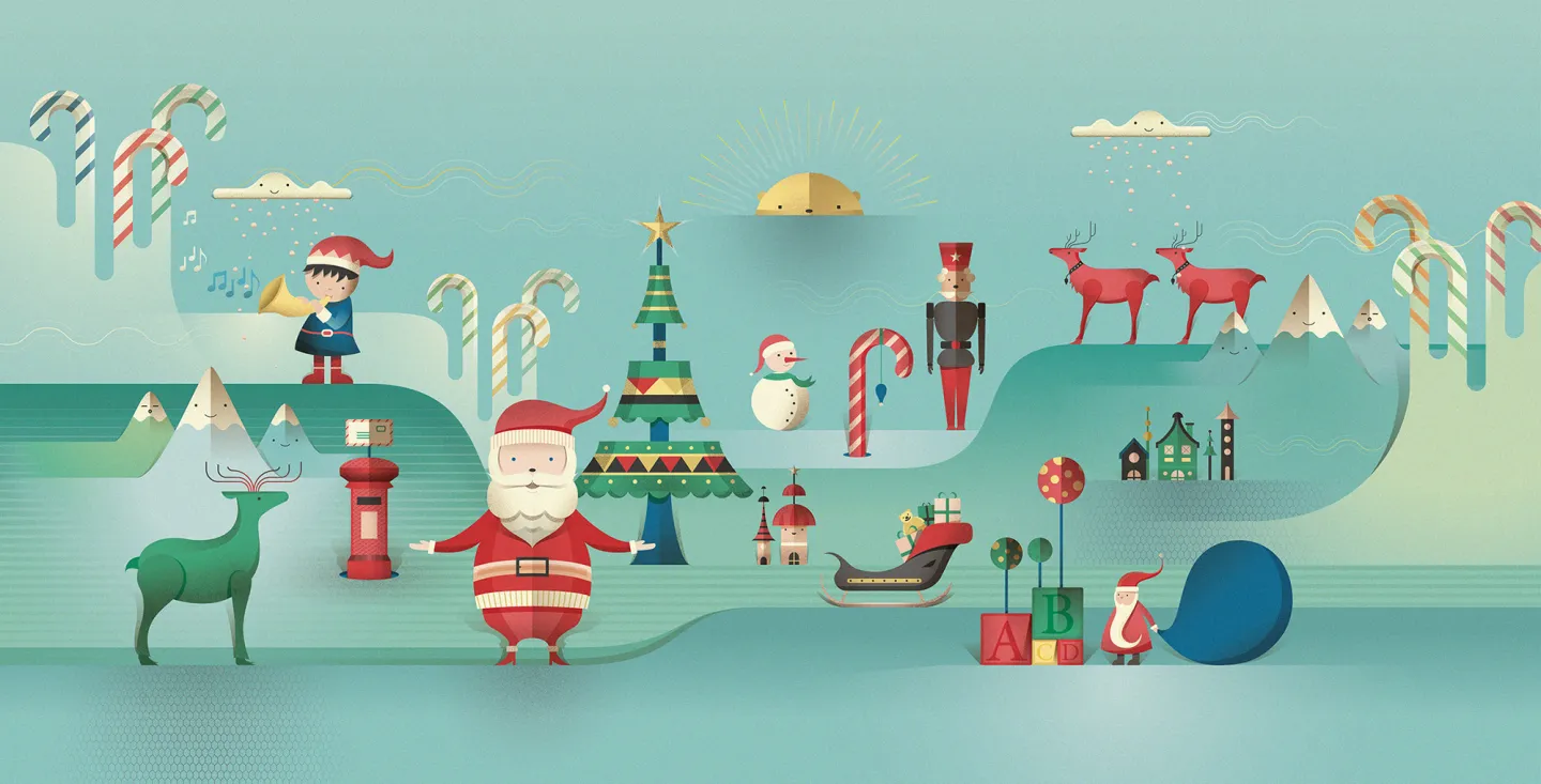 Diseño y dirección de arte de avisos y POP para campañas en todos los Shoppings de Cencosud. Navidad: Ilustración por Tooco.​​​​​​​