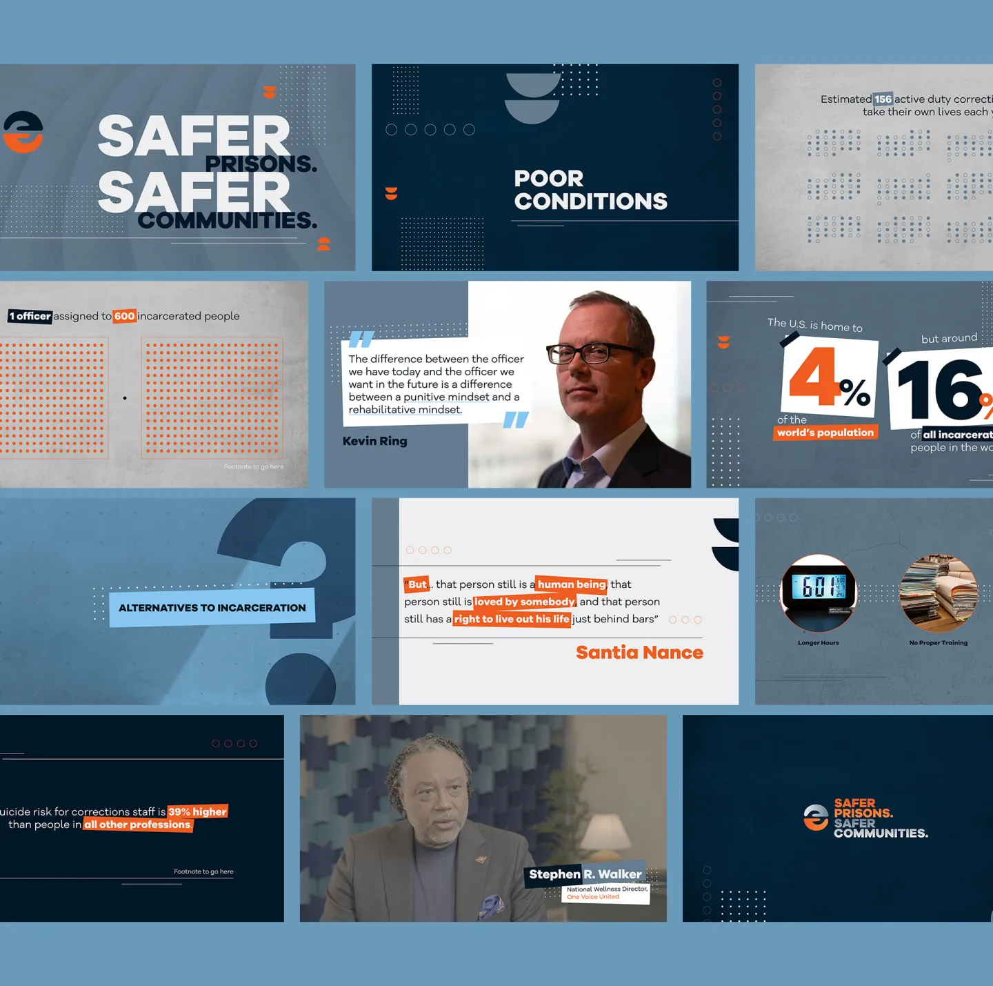 Diseño de logotipo, identidad y manual de marca para Safer Prisons, Safer Communities por Arnold Ventures. Campaña para crear conciencia y abordar las crisis interconectadas de falta de personal, hacinamiento y malas condiciones en las prisiones nacionales de EE. UU.